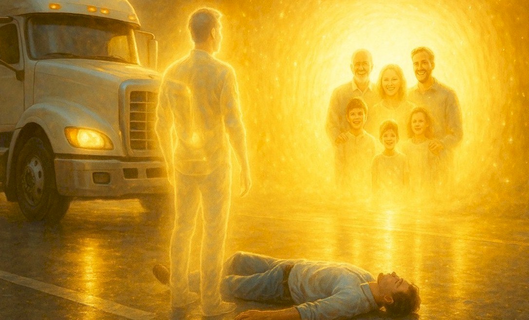 It was at this moment that he watched himself in the street [sic], critically injured, while he observed the whole scene of the accident from a few feet above. It was at this moment that his family appeared in front of him, in a glow of light with an incredible sense of love. They had happy smiles on their faces, and simply made him aware of their presence, not communicating in any verbal way but in the form of thought transference, sharing with him the joy and happiness of their present existence.