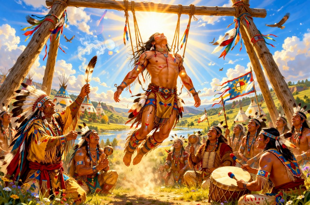 An initiation ritual performed by Native American Indians during the 1800’s to induce an NDE is performed today by people who are into “body suspension.” According to the Suspensions and Tensions website, the Indian ritual, called “O-Kee-Pa” involved the young male initiate to be: “suspended by either set of piercings from the roof of a lodge. In extreme pain, followed by trance, the young men were hung up for about twenty minutes to seek communion with the Great White Spirit. Legend has it that initiates traveled out of their bodies in this state and were guided through unseen worlds by their Ka-See-Ka who knew the way. The O-Kee-Pa journey was like a canoe trip on a tricky river: the initiate submitted and just rode in the canoe while the Ka-See-Ka steered it to appropriate vistas and to avoid rocks. Through the years, neighboring tribes, especially the Arikara and Minnetaree, were exposed to the Mandan ritual and developed their own piercing rites, often more severe …”