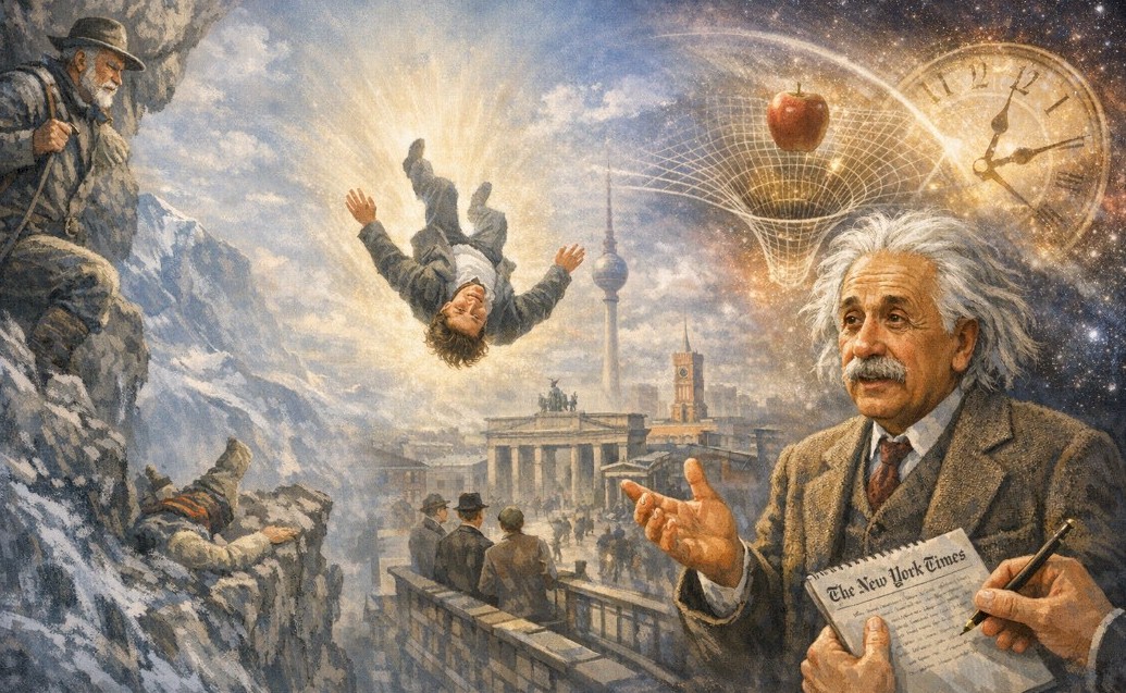 To this point, my argument rests on a great deal of speculation. But there is another anecdote that appears to nail down the issue rather conclusively, simply because it came directly from Einstein. Asked in a New York Times interview how he came to start work on the theory of relativity, Einstein related the idea to a near-death event he had witnessed: “He had been triggered off… by seeing a man falling from a Berlin rooftop. The man had survived with little injury. Einstein had run from his house. The man said that he had not felt the effects of gravity – a pronouncement that led to a new view of the universe” (Clark, 1971, p. 303).