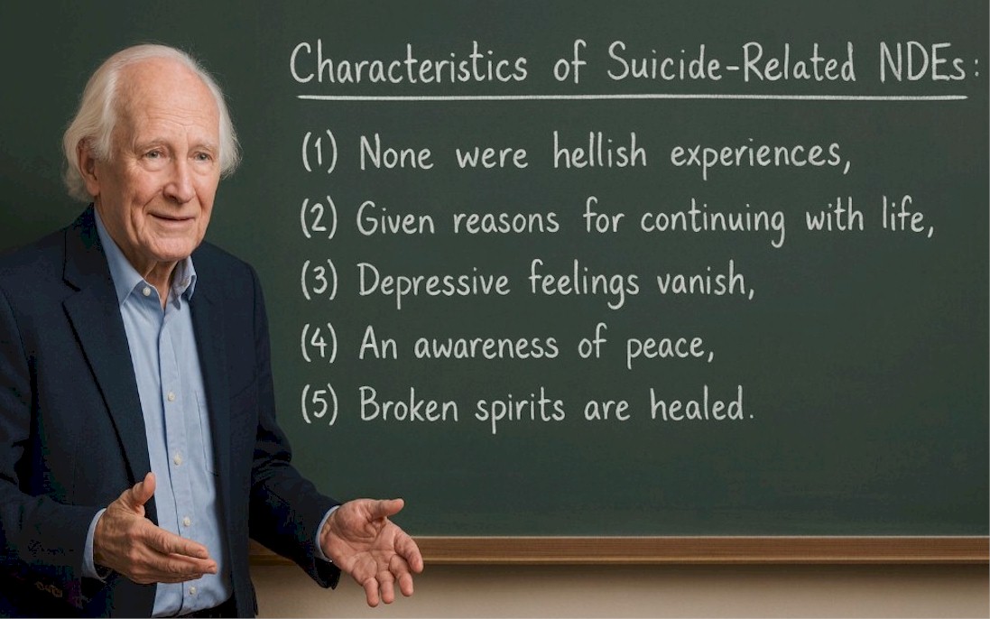 According to a study by Dr. Peter Fenwick, no one submitted to him an NDE resulting from a suicide attempt that reported a hellish experience. They usually experienced what provided a great reason for continuing with life. The NDEr’s mental state after the experience bears no resemblance to the NDEr’s mental state before the experience. People who attempt suicide are generally known to be in a depressed emotional state at the time of their experience. Yet such NDEs also show that these depressive feelings vanish when the NDE begins; then there begins an awareness of peace, of something beautiful; there seems to be a healing of the broken spirit.