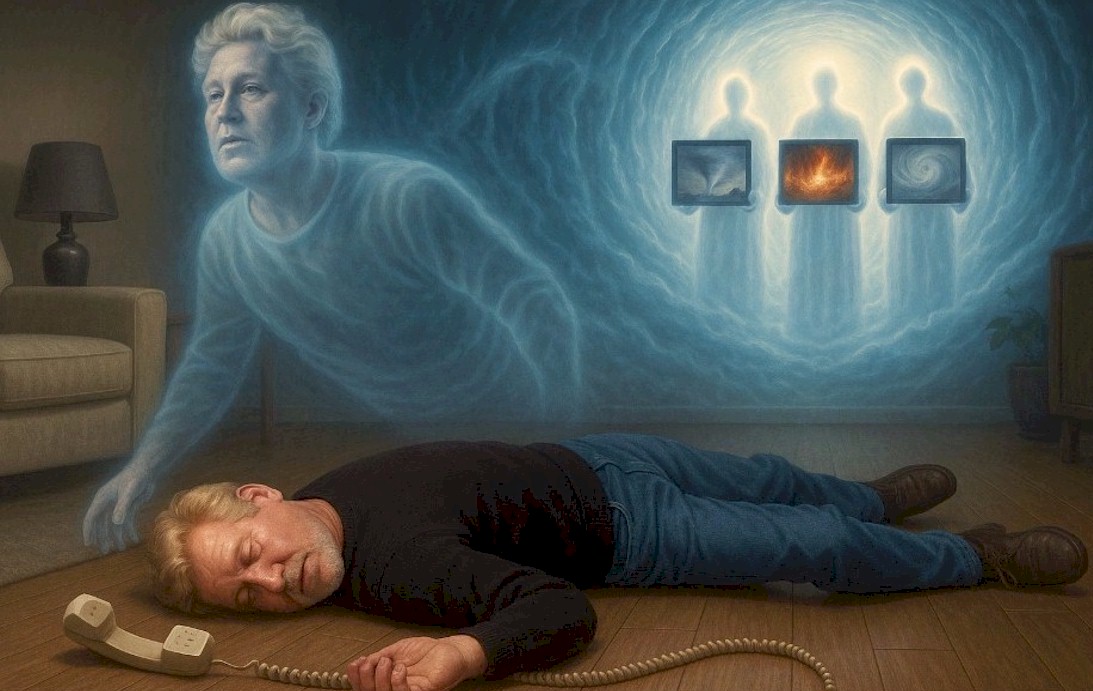 He began to look around, rotating in midair. Below him lay his own body, sprawled across the bed. His shoes were still smoking, and the telephone in his hand had melted. He saw Sandy rush into the room, her expression dazed and horrified, like a parent discovering their child face-down in a swimming pool.
